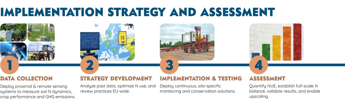 5 pilot sites: High-frequency data on soil, crop, and atmospheric nitrogen dynamics will be collected around the clock over two growing seasons, using state-of-the-art sensor networks, automated gas flux chambers, and remote sensing technologies. Nitrogen losses will be measured to assess fertilizer use efficiency, and various soil management practices will be tested to improve regional nitrogen balance models and provide better recommendations.